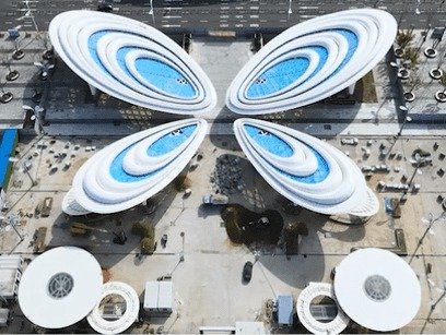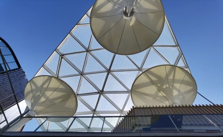 PTFE Coated Fiberglass is considered one of the most durable materials in the fabric structures industry with a life expectancy of 50+ years, PTFE, or polytetrafluoroethylene, is a Teflon™-coated woven fiberglass membrane. It is an extremely strong, up to 500 Kg per Square Meter. Due to low surface energy from its chemically inert coating, PTFE membrane is capable of withstanding extreme temperatures and is easy to maintain and keep clean. It is also completely immune to UV degradation. Whether it’s for an enclosed structure or a fabric building façade, PTFE-coated fiberglass membrane is a popular option as it passes the most stringent fire code compliance tests, including ASTM E-126 and is Class A fire-rated. Depending on fabric thickness required, light transmissions range from 12% to 17%. The fabric has a 15 years 100% warranty and 20 years reducing warranty. PTFE membrane is installed beige in colour but bleaches permanently white with sun exposure. Coloured PTFE membrane is not available off the shelf, and requires a premium and a purchase of the entire fabric lot. These fabrics are available with manufacturers from Germany, Japan and US